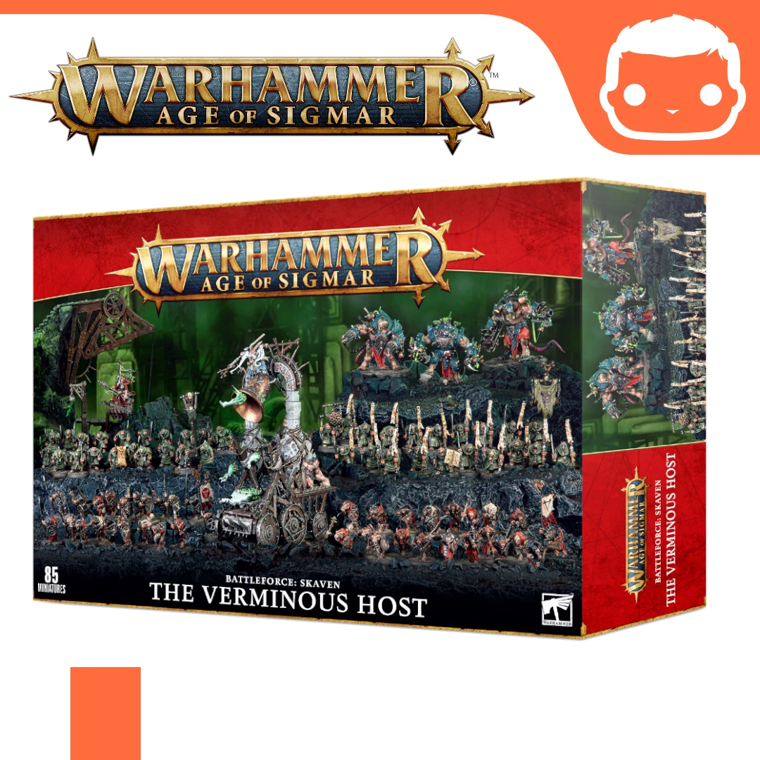 The scabrous hosts of the Skaven skitter from their subterranean lairs all across the Mortal Realms, rising up in a chittering tide. Led by a Grey Seer riding atop a clanging Screaming Bell, hordes of Clanrats and Plague Monks swarm across the battlefield, stabbing with filth-coated weapons, as the withering firepower of Stormfiends and a screeching Warlock Bombardier crackles overhead. This mighty force will drown the enemies of the Horned Rat in a flood of blades, noxious fumes, and arcs of warpstone energy.