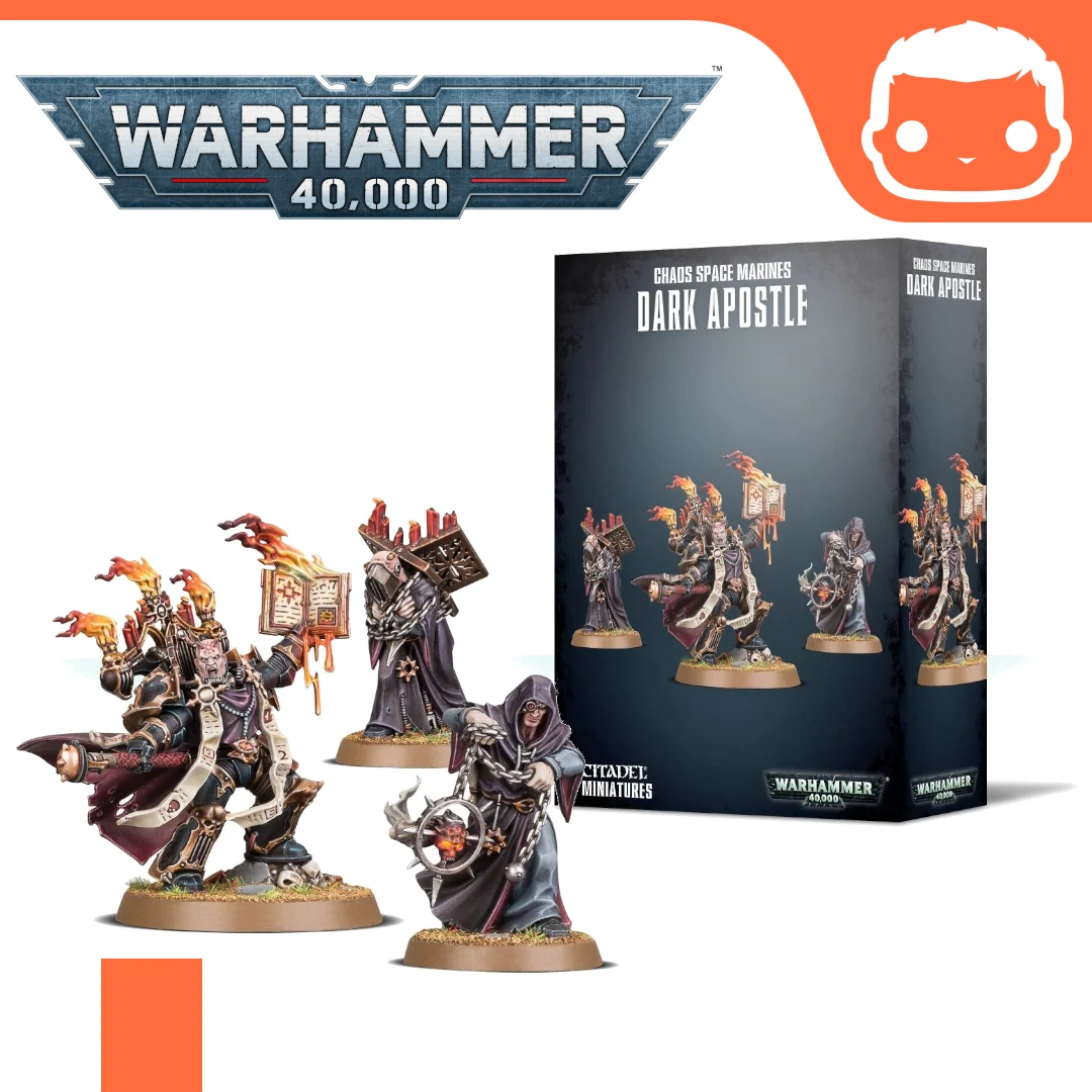 The Dark Apostle set is a 3-model, multipart plastic kit. The Dark Apostle is an integral HQ choice in a Chaos Space Marines army and can be accompanied by a pair of Dark Disciples. The Dark Apostle bears an accursed crozius and a fell daemonic tome. In battle, he can chant prayers to beseech the Dark Gods for their unholy blessings. The relics of corruption carried by the Dark Disciples aid their master in his prayers to the Chaos Gods.