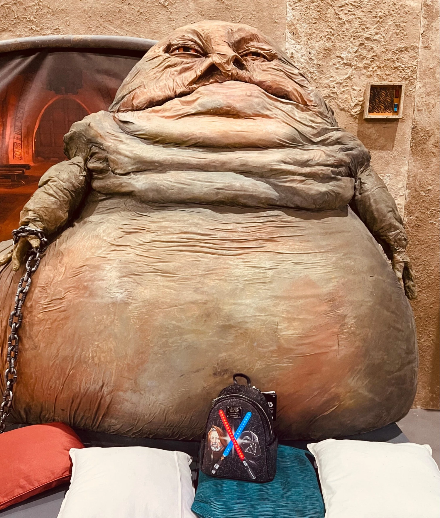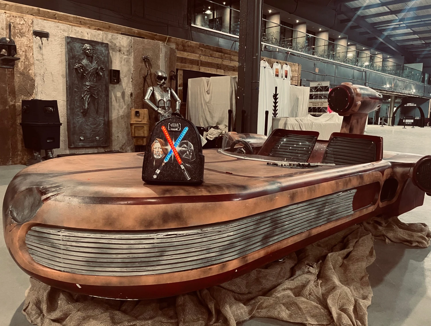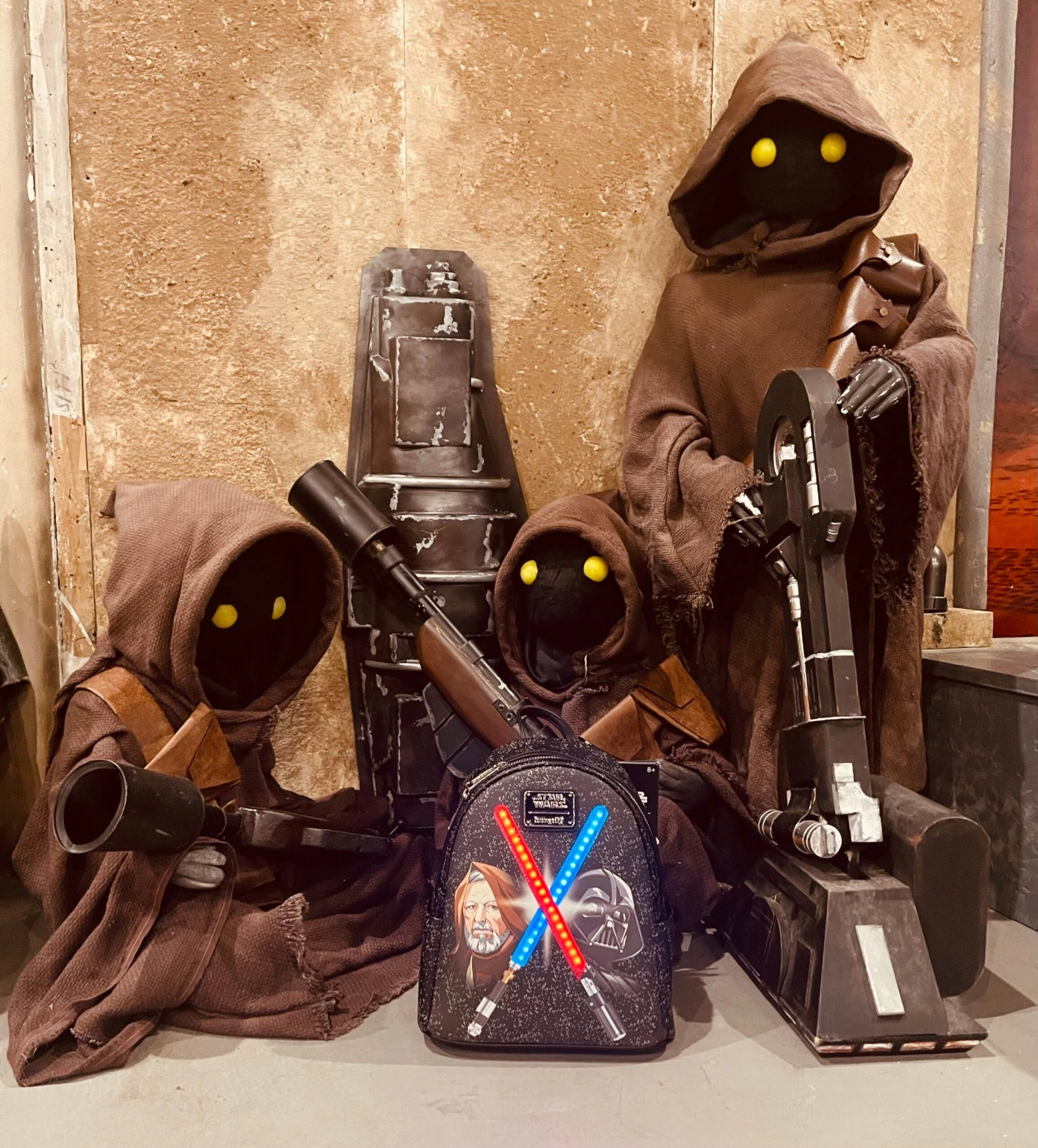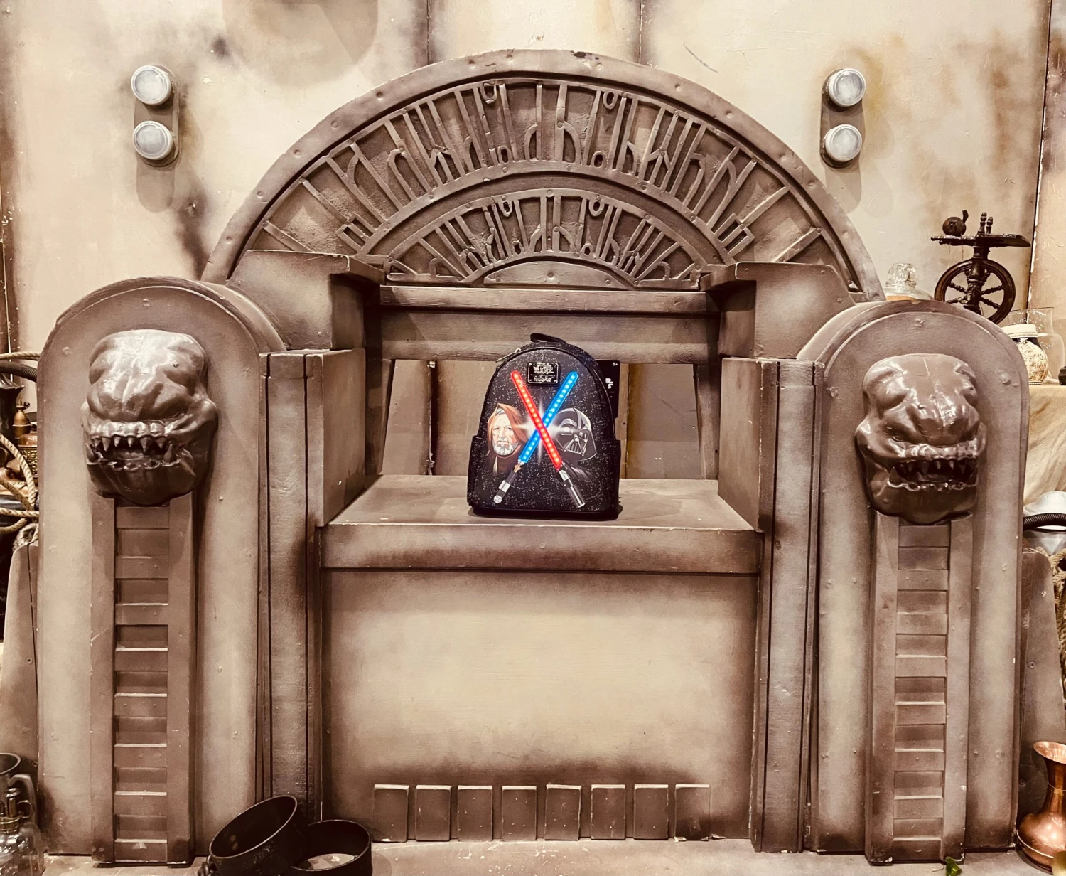 Features: Side pockets, adjustable shoulder straps, silver hardware, glow-in-the-dark stars, LED strip lights, and printed details.
