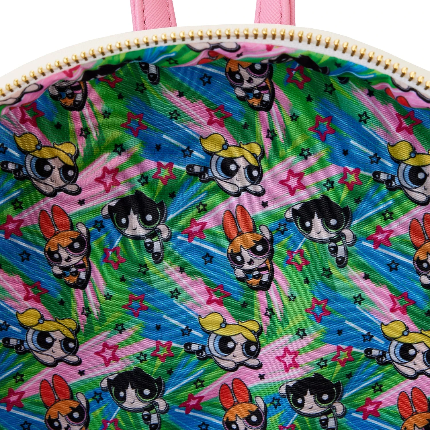 The Loungefly Powerpuff Girls Triple Pocket Backpack is made of vegan leather (polyurethane). Bag has adjustable shoulder straps and sturdy metal hardware. Additional features include applique, debossed, and printed details. Take note of the coordinating inside lining.