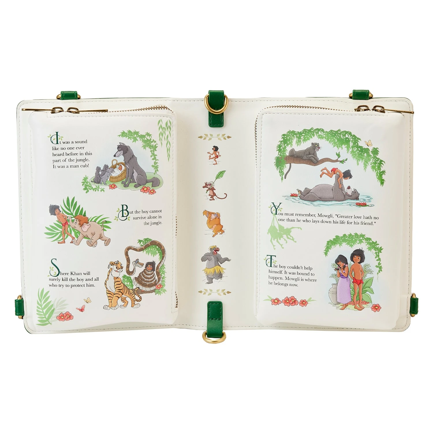 Another adventure for the books! Carry our Loungefly Disney The Jungle Book Convertible Crossbody Bag and let the fun begin. This beautiful interpretation of a Disney classic book features a “front cover” with gold foil lettering on the front and down the “spine.” Cherished characters gather in the jungle, including Mowgli, Baloo, and Bagheera. On the back, Shere Khan shows off his claws. Inside, hand-drawn, original illustrations bring characters and scenes to life. These characters include King Louie; Mowgli; Bagheera; Kaa; Raksha, Rama, and their cubs; Hathi Jr., Shere Khan; Baloo, and more. Not only do they appear on the “pages” when the book is opened but also down the middle. Easily convertible, this bag can transform into a backpack with the book lying open against your back or can be worn closed as a crossbody purse. With secure zipper pockets disguised as book pages, this multi-function bag is the perfect accessory for all the wondrous outings you’ve bookmarked.