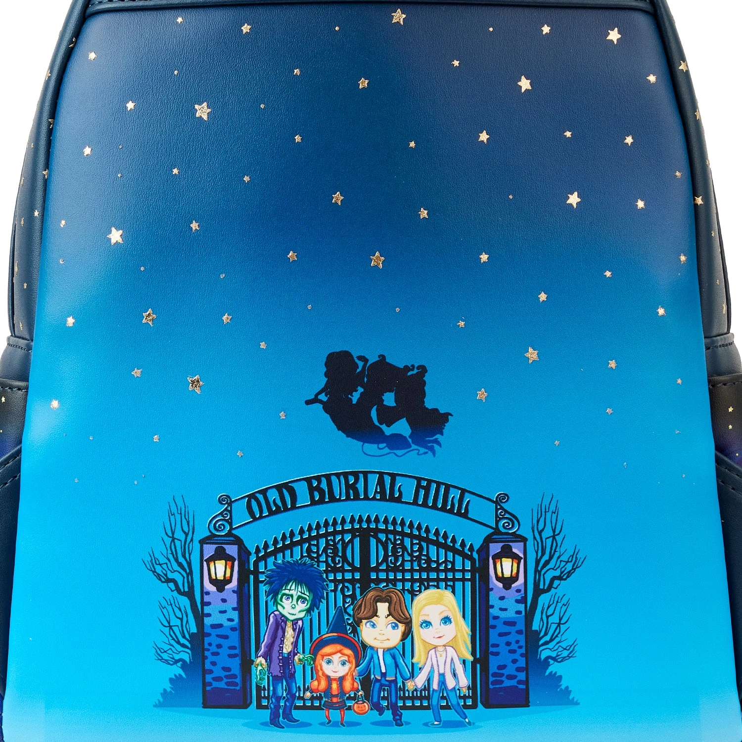The moon is actually a figural pocket, where you can secure smaller items for all your journeys. Billy Butcherson, Max Dennison, Dani Dennison, and Allison gather below at the gates of Old Burial Hill. Binx also makes an appearance, flying over the Sanderson Sisters. Haunting details continue on the side pockets, too, where you’ll find the Sanderson Sisters gathered around a cauldron and Billy Butcherson climbing out of his grave.