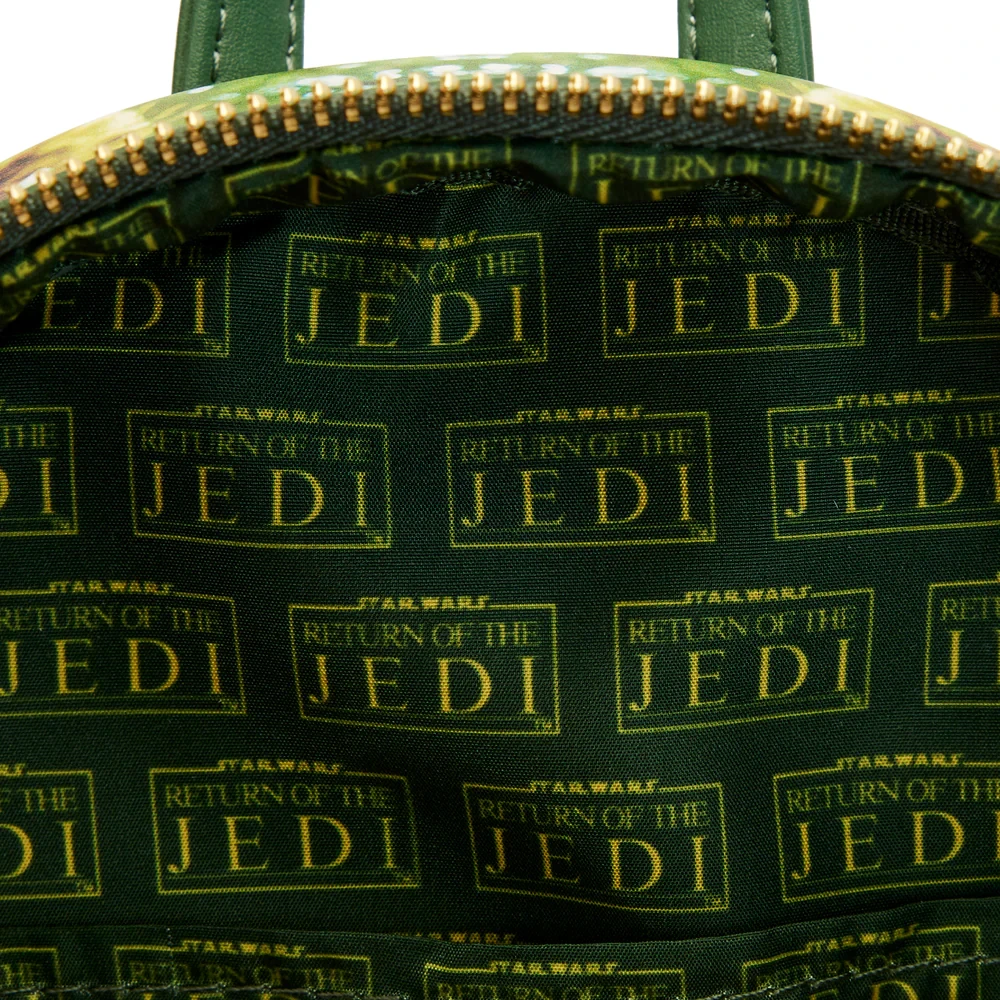The Loungefly Star Wars: Return of the Jedi Mini Backpack is made of vegan leather (polyurethane). Bag has adjustable shoulder straps, sturdy metal hardware, and features printed details. Take note of the coordinating inside lining.
